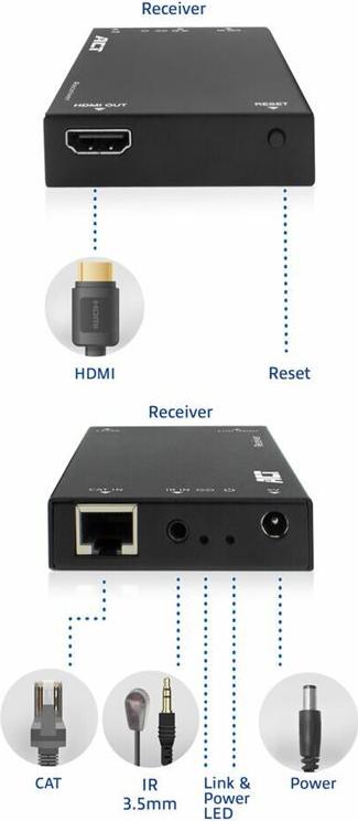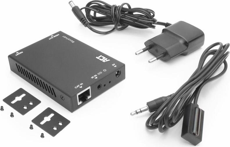 Der AC7853 HDMI-Empfänger kann als zusätzliche Empfangseinheit in einer Punkt-zu-Mehrpunkt-Konfiguration mit dem AC7852 HDMI over IP Extender Set verwendet werden. Schließen Sie bis zu 253 Empfänger über einen Netzwerk-Switch an den AC7852 an. In einer Punkt-zu-Mehrpunkt-Konfiguration muss der Switch Layer 3, IGMP (Internet Group Management Protocol) und Multicast unterstützen. Der AC7853 wird mit Montagehalterungen und einem IR-Empfänger geliefert.