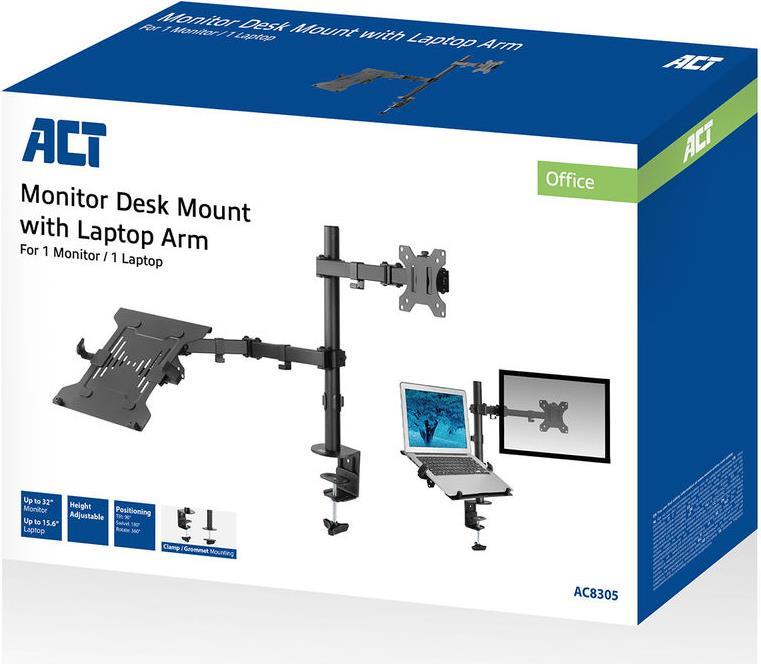 Die AC8305 Monitor-Tischhalterung mit Laptop-Arm schafft eine ergonomische und platzsparende Arbeitsumgebung. Befestigen Sie diese Monitorhalterung einfach an oder durch einen Schreibtisch. Befestigen Sie einen Bildschirm mühelos an der AC8305 mit dem einfachen Bildschirmhalterungssystem. Die Halterung verfügt über 3 Drehpunkte, um einen großen Betrachtungsabstand zu erhalten. Stellen Sie Monitor und Laptop mit den flexiblen Bildschirmeinstellungen ein: Neigen, Drehen und Schwenken. Mit dem Kabelmanagementsystem bleiben die Kabel außer Sichtweite.