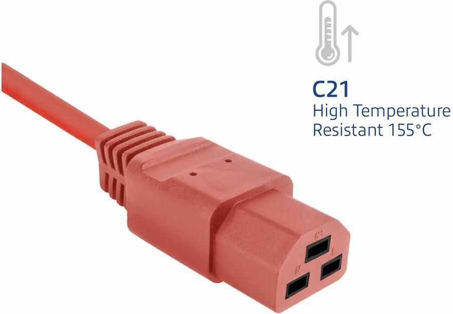 Das Netzkabel C14 auf C21 wird für die Stromversorgung von Geräten wie Servern der am häufigsten verwendeten Marken verwendet. Der C21-Steckverbinder ist hochtemperaturbeständig bis 155°.