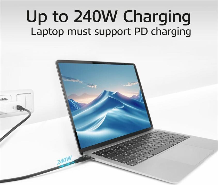 Verbinden Sie Ihre USB-C-Geräte mit dem AC7420 USB4 20Gbps USB-C-Kabel. Das Kabel kann eine maximale Datenübertragungsgeschwindigkeit von bis zu 20 Gbps erreichen und dank des erweiterten Leistungsbereichs eine Leistung von 240 W verarbeiten. Das AC7420 unterstützt den DisplayPort Alternate Mode 1.4 mit einer maximalen Auflösung von bis zu 4K bei 60 Hz und ist abwärtskompatibel mit USB 3.2, USB 3.1, USB 3.0 und USB 2.0.
