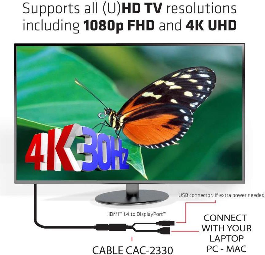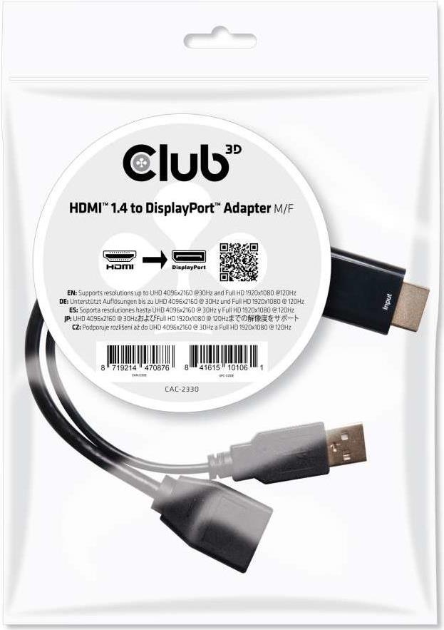 Der Club 3D HDMI-auf-DisplayPort-Adapter ist die perfekte Lösung, um Ihre Produkte, die einen HDMI-Ausgang haben, wie z.B. Spielekonsolen oder Notebook, mit einem Bildschirm mit DisplayPort-Eingang zu verbinden. Es ist mit einem USB-A-Port ausgestattet, um Strom zu liefern, falls die HDMI-Quelle nicht genug Strom hat. Der CAC-2330 Adapter bietet eine plug-and-play Installation, verbunden mit einem mühelosen Setup ohne Software oder Treiber, die installiert werden müssten.