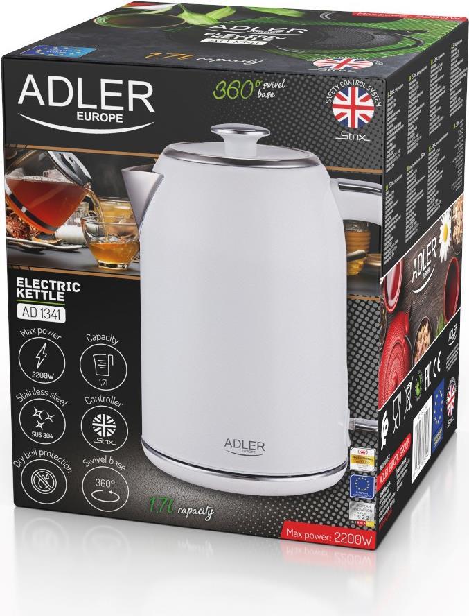 Adler Wasserkocher AD 1341 elektrisch, 2200 W, 1,7 l, Edelstahl, 360° drehbarer Sockel, weiß (AD 1341)