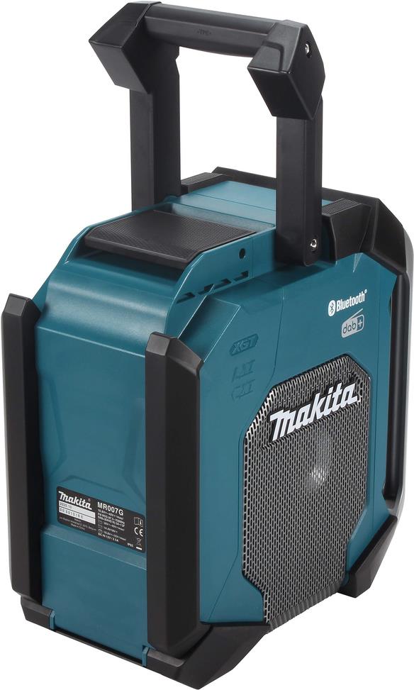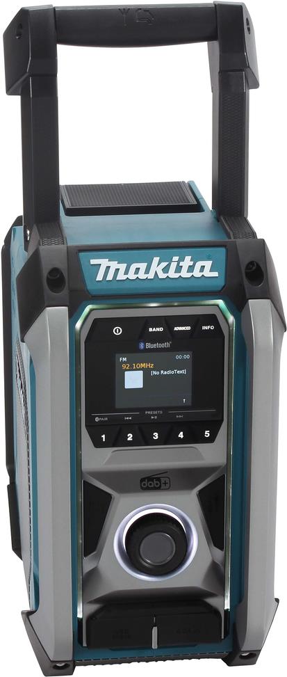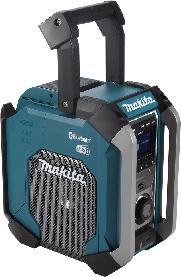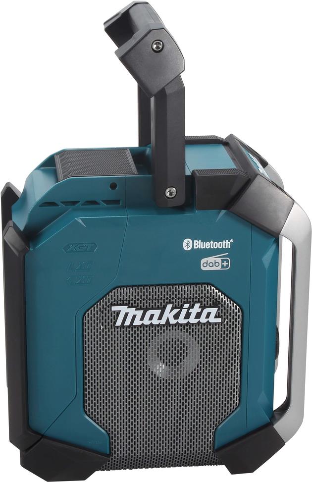 Robustes hochleistungsfähiges Baustellenradio von Makita. Mit IP65-Gehäuseschutzklassifizierung. Läuft mit allen Schiebeakkus der Akku-Systeme CXT 12 V max., LXT 18 V und XGT 40 V max. oder dem mitgelieferten Netzteil. Wiedergabe über Bluetooth mittels Smartphone o. Ä. DAB+ Empfang, AUX-Anschluss und USB-Anschluss, letzteres zum Aufladen des Smartphones. Mit Subwoofer auf der Gehäuseunterseite sowie Mittel- und Hochttonlautsprecher an den Seiten für satten und klaren Sound.