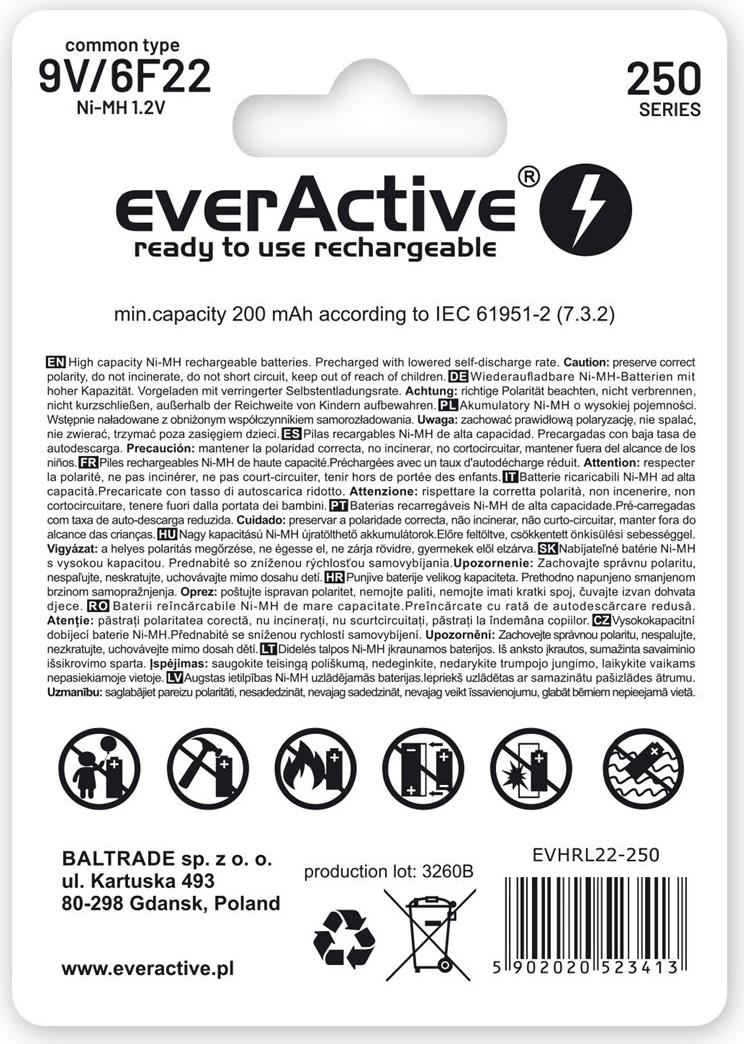 Everactive EVHRL22-250 Haushaltsbatterie Wiederaufladbarer Akku 9V Nickel-Metallhydrid (NiMH) (EVHRL22-250)