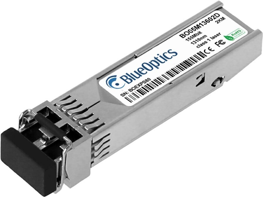 Alcatel-Nokia 3HE09500AA kompatibler BlueOptics© SFP Transceiver für Multimode 155Mbit Datenübertragungen in Glasfaser Netzwerken. Unterstützt Ethernet, Fibre Channel oder SONET/SDH Anwendungen in Switchen, Routern, Storage Systemen und ähnlicher Hardware (3HE09500AA-BO)