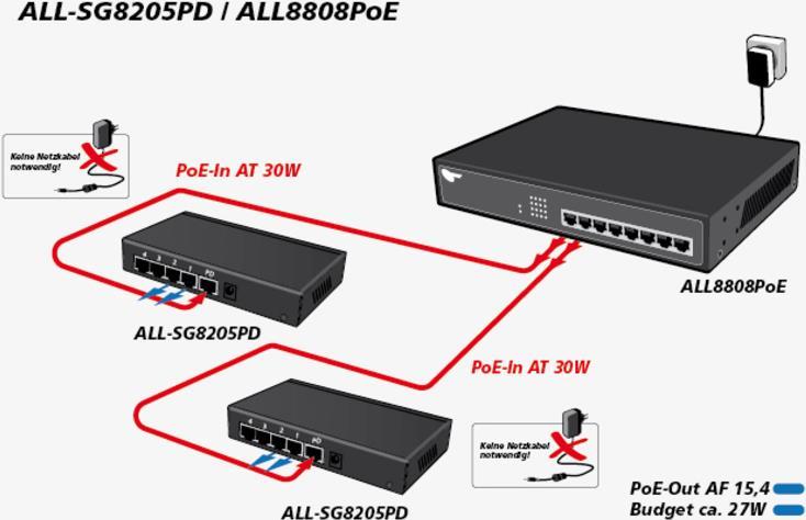 - Eigenverbrauch 3W (PoE Budget ca. 22W für weitere 4 Ports)