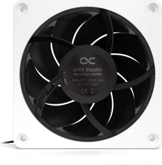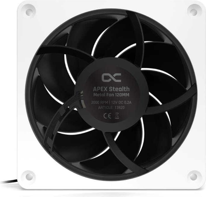 Alphacool Apex Stealth Metall. Typ: Ventilator, Lüfterdurchmesser: 12 cm, Rotationsgeschwindigkeit (min.): 400 RPM, Rotationsgeschwindigkeit (max.): 2000 RPM, Geräuschpegel (langsame Geschwindigkeit): 20 dB, Geräuschpegel (hohe Geschwindigkeit): 29,9 dB, Maximaler Luftstrom: 76,81 cfm, Luftstrom: 130,501 m³/h, Lagertyp: Hydrodynamisches Lager (HDB). Breite: 120 mm, Tiefe: 120 mm, Höhe: 25 mm. Produktfarbe: Weiß (13820)