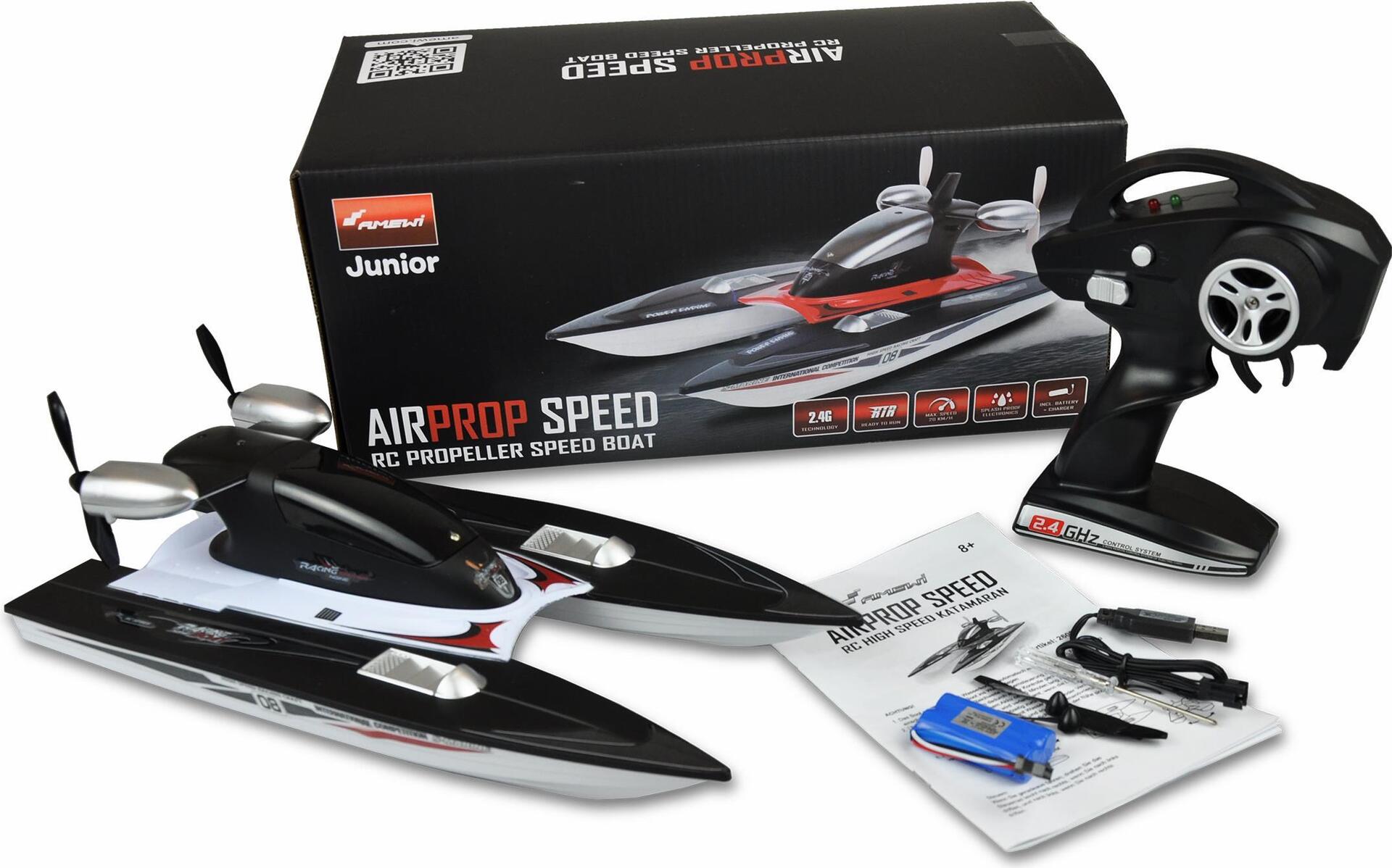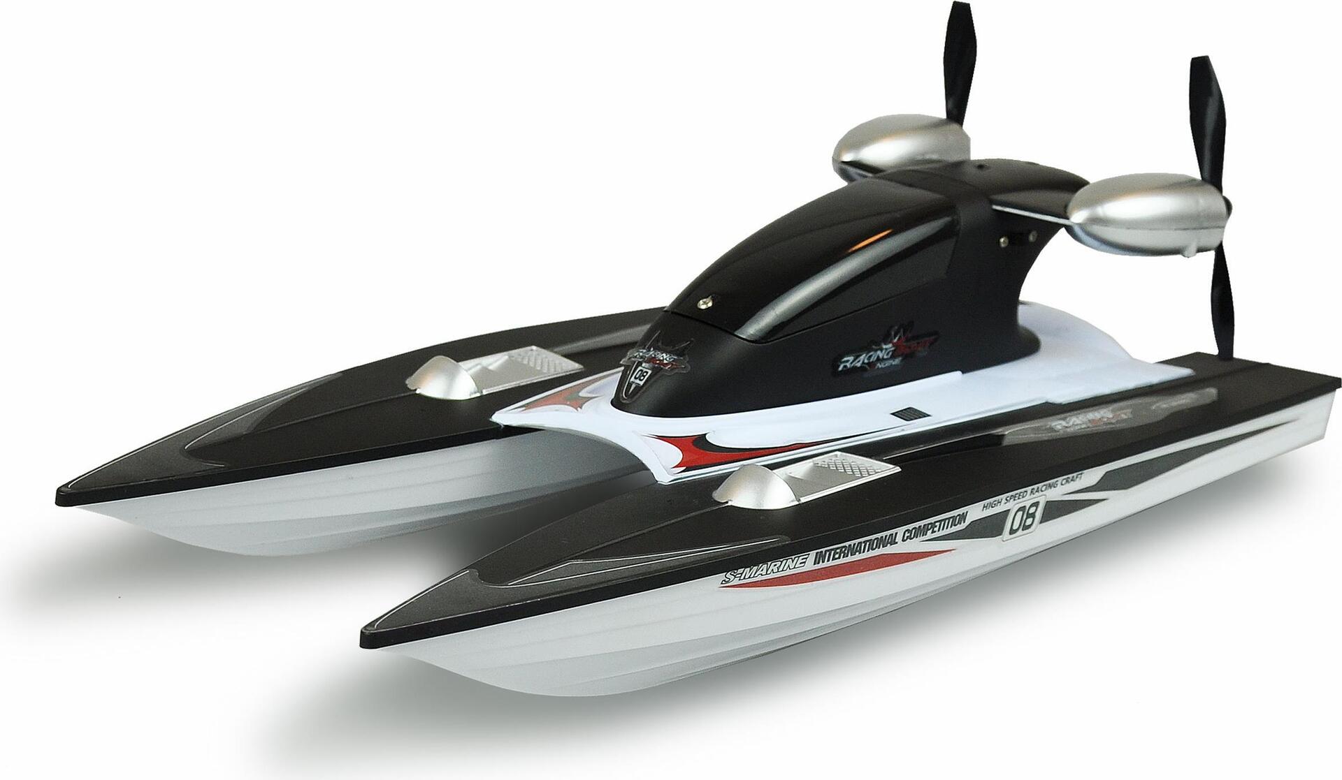 Wendiger High Speed Katamaran im Stil eines propellergetriebenen Flachbootes mit einem Top-Speed von bis zu 20 km/h. Vortrieb und Lenkung des Modells erfolgt über zwei erhöht angebrachte Propeller am Heck des Modells, ...