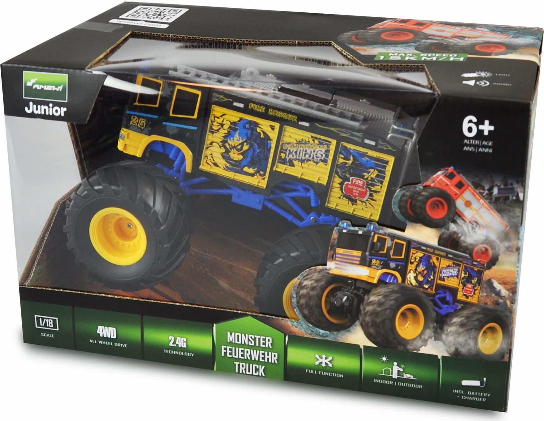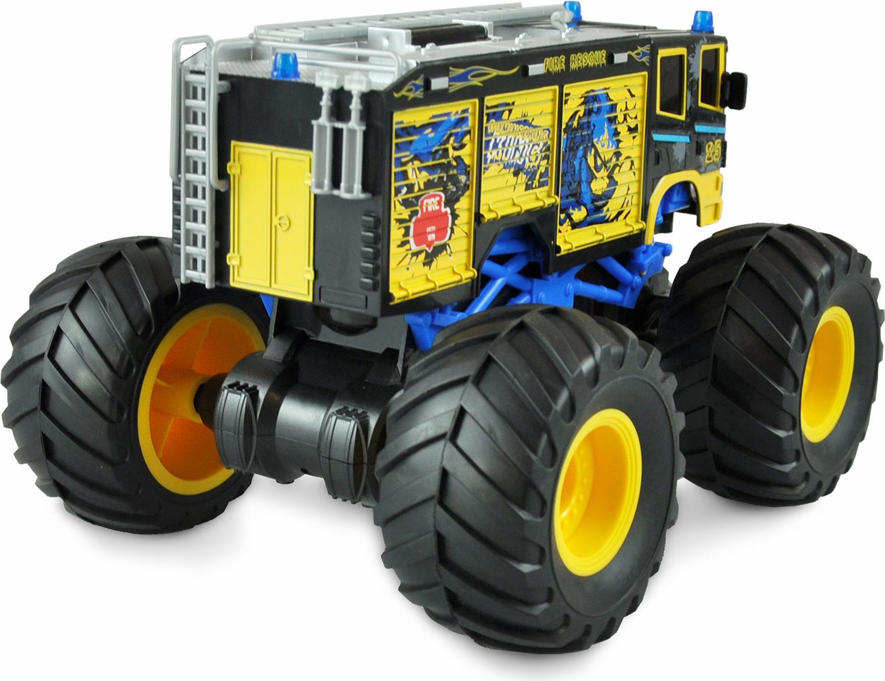 Monster Feuerwehrtruck im Maßstab 1:18 mit Licht und Sound (deaktivierbar), in einer coolen Optik. Am futuristischen Sender in Form eines Gamepads lässt sich das Modell mit einemTastendruck starten (Startgeräusche) und ...