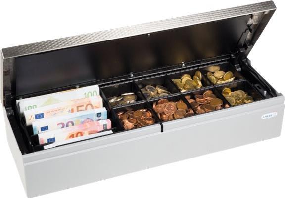 Das ANKER-Konstruktionsprinzip aus Kassette und Basis hat Sie begeistert aber Sie möchten auch beim Geldeinsatz nicht auf Metall verzichten? Dann ist die ANKER Cash & Carry Geldkassette CCC genau das Richtige für Sie. Basis, Außengehäuse und Geldeinsatz aus verzinktem Stahlblech bilden zusammen mit dem Edelstahldeckel, im wahrsten Sinne des Wortes, eine geschlossene Einheit. Die CCC kommt ganz ohne Schlu¨ssel aus. Die Öffnung des Außengehäuses wird ausschließlich über das Kassensystem gesteuert. Ein Schloss entfällt. Auch innen kann auf ein Schloss verzichtet werden, da der Deckel des Geldeinsatzes nach der Entnahme aus dem Gehäuse per Magnet gesichert wird. Die Mu¨nz- und Scheinfächer im Einsatz werden je nach Bedarf auf der linken oder rechten Seite der Kassette eingesetzt. Der Geldkassetteneinsatz hat acht wiegbare Münzfächer.