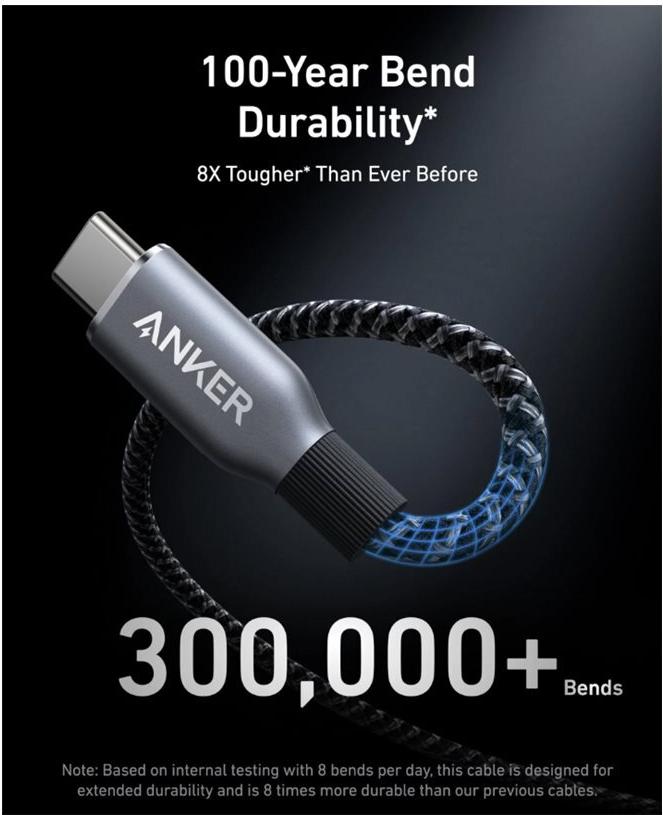Das Anker Prime USB-C-Kabel ist auf Haltbarkeit und Funktionalität ausgelegt. Mit einem robusten, geflochtenen Nylonmantel bietet dieses Kabel Widerstandsfähigkeit und Flexibilität und gewährleistet eine lange Lebensdauer auch bei intensiver Nutzung. Das Kabel unterstützt eine schnelle Datenübertragungsrate von 480 Mbit/s und ermöglicht so eine effiziente Datenübertragung sowie ein schnelles Aufladen mit USB Power Delivery mit bis zu 240 W. Sie können sich darauf verlassen, dass dieses Kabel mehr als 300.000 Biegungen standhält und somit die ideale Wahl für den täglichen Gebrauch ist.