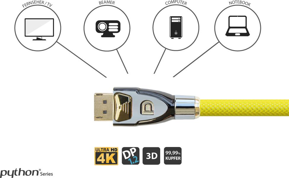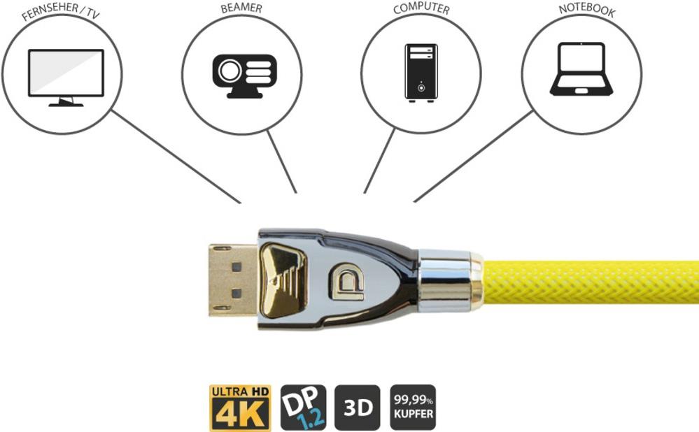Auflösungen bis zu 4K2K / UHD Dieses DisplayPort 1.2 Kabel unterstützt Auflösungen bis zu 4096 x 2160 Pixel bei 60Hz. Die perfekte Verbindung für Ihr neues UHD Display und weitere Geräte mit DisplayPort-Anschluss. Hochwertige Materialien Der Leiter dieses Kabels besteht zu 99,99% aus sauerstofffreiem Kupfer (OFC). Dies ermöglicht eine optimale Signalübertragung und höhere Bruchfestigkeit des Kabels. Vollmetallstecker Die massiven und geschirmten Vollmetallstecker mit vergoldeten Kontakten garantieren eine optimale Verbindung. Dreifachschirmung und Nylongeflecht Die dreifache Schirmung des Kabels sorgt für eine gleichbleibend hohe Signalübertragung. Das Nylongeflecht lässt Ihr Kabel dabei noch besonders gut aussehen!