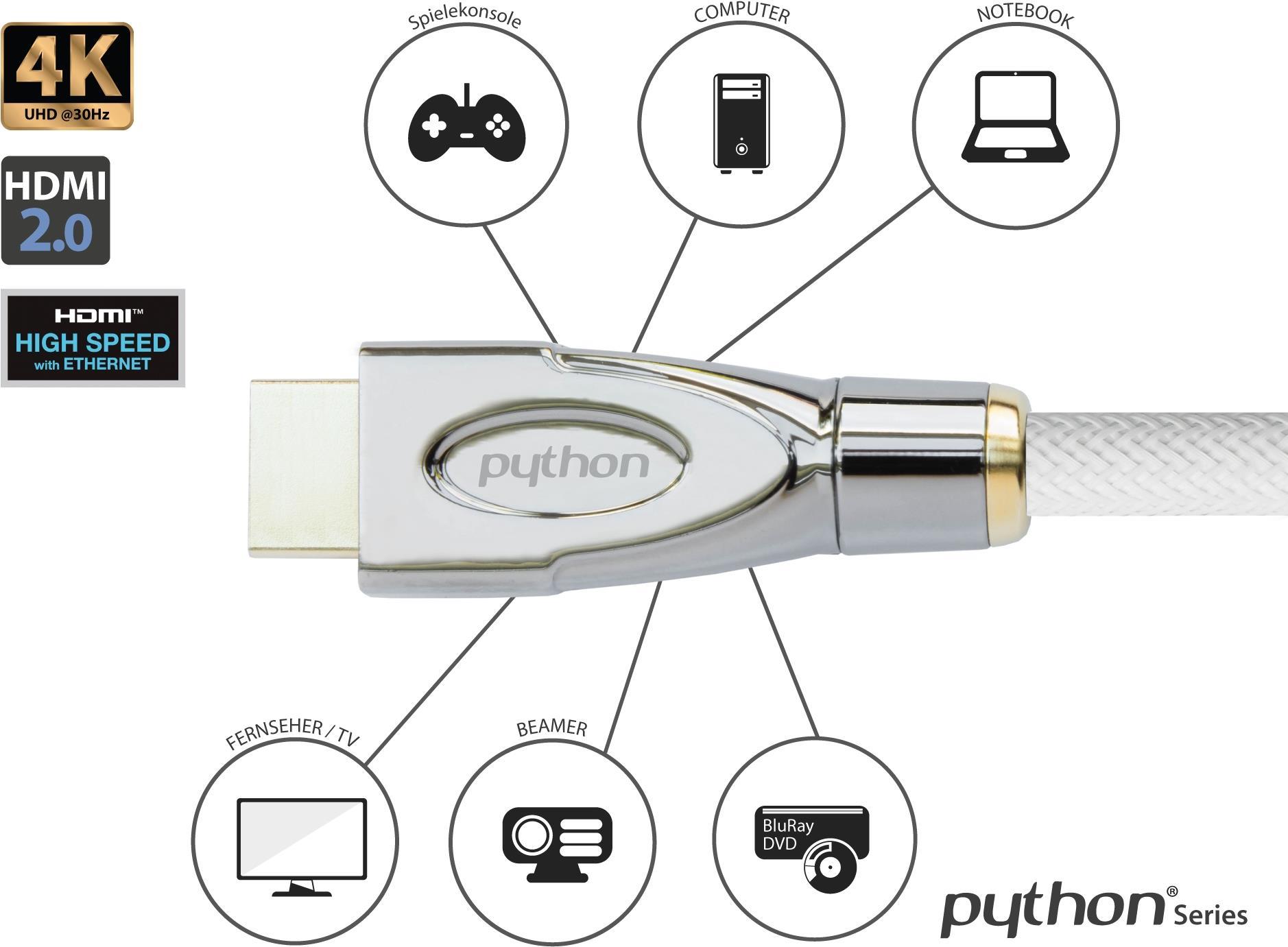 Anschlusskabel High-Speed-HDMI® mit Ethernet 4K2K / UHD, AKTIV, 24K vergoldete Kontakte, OFC, Nylongeflecht weiß, 30m, PYTHON® Series (GC-M0170)