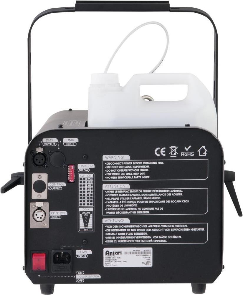ANTARI S-200X geräuscharme SchneemaschineGeräuscharme Schneemaschine mit DMX-Schnittstelle.Ausstattung: Absolut geräuscharmer Betrieb bei max. 63 dBVerbesserte Version mit ca. 50 % höherem Ausstoß als das Vorgängermodell S-200Metallgehäuse mit Tragegriff, schwenkbarem Hängebügel und FangseilöseHerausnehmbarer TankSteuerung per integrierter DMX-Schnittstelle oder beiliegender Kabelfernbedienung SC-25-Liter-Tank für DauerbetriebTechnische Daten: Ausstoß-Volumen: 180 m³/minDMX-fähig: JaEffektmaschinen-Besonderheiten: inkl. Kabelfernbedienung,inkl. BefestigungsbügelEffektmaschinen-Typ (Kategorisierung): SchneemaschineFarbe: GrauGewicht: 11 kgProduktabmessung, Breite: 276 mmProduktabmessung, Höhe: 280 mmTankinhalt: 5 lWeitere technische Daten: Fluidverbrauch: 5,5 Min./Liter (100 % Ausstoß).