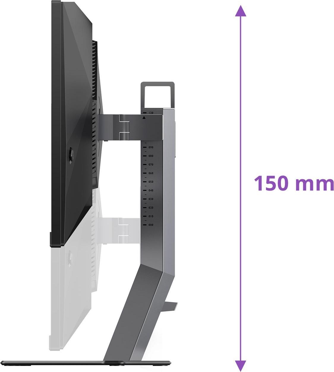 Höhenverstellbar (150mm Hub), Pivot-Funktion (90° drehbar), Schwenkbar (Swivel ±28°), Neigbar (Tilt -5° bis +25°), abnehmbarer Kopfhörerhalter |