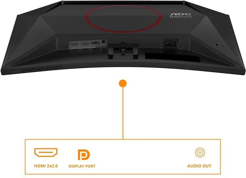 1x DisplayPort 1.4, 2x HDMI 2.0, 1x 3.5mm Klinke Line-Out, 1x AC-In C14 (Netzanschluss) |