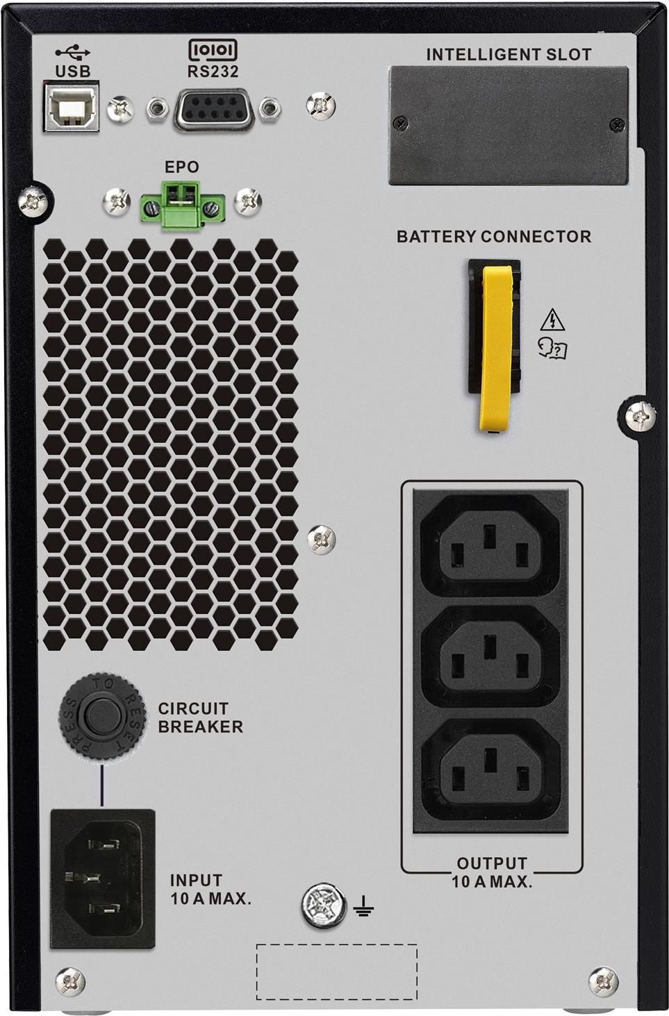 | Besonderheiten | Vertikale Ausrichtung, hörbarer Alarm, Not-Aus, LCD Anzeige, interner Bypass, Eco-Mode, generatorkompatibel, Intelligentes Batteriemanagement, Doppelwandlerprinzip, Alarm bei schwacher Batterie, Überlastalarm |