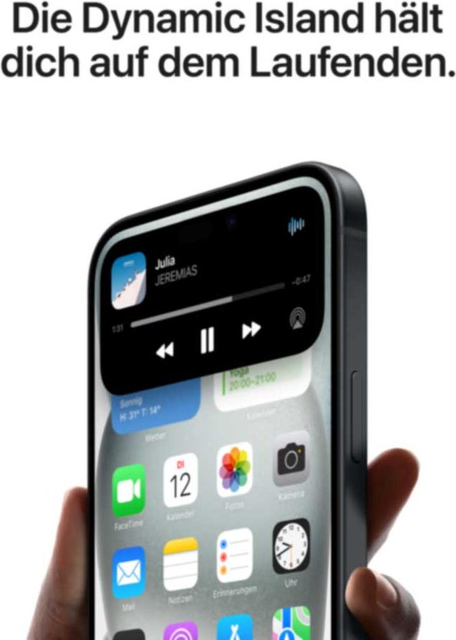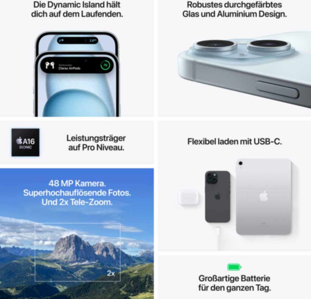 | Markenspezifische Technologien | Dynamic Island, Haptic touch, True Tone, Breite Farbe (P3) |