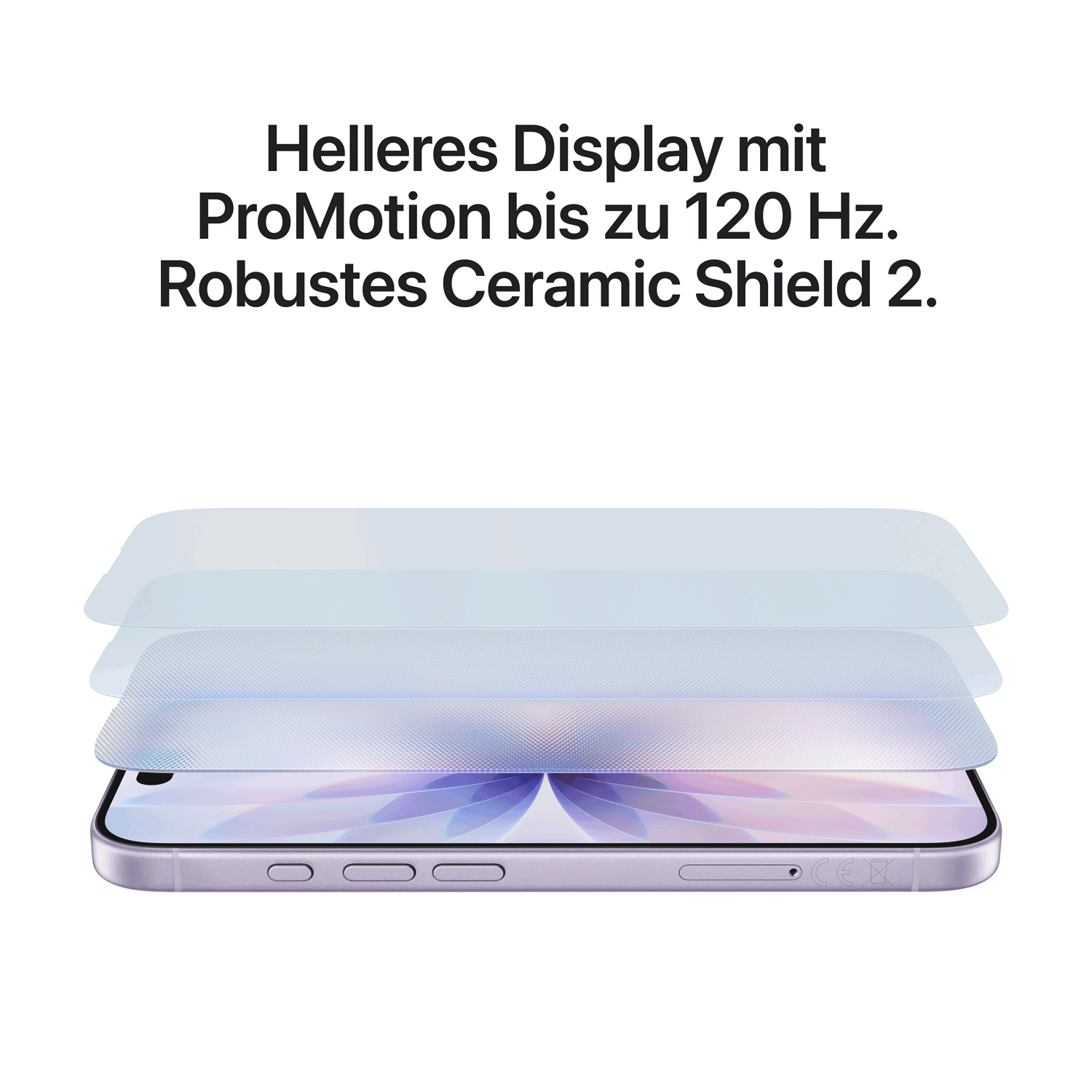 6.3", 2622x1206 Pixel, OLED/?LTPO, kapazitiver Touchscreen, Ceramic Shield 2, flach, Kameraloch, HDR (HDR10+, Dolby Vision), 1-120Hz Aktualisierungsrate, 3000 Nits (maximal), 458ppi |
