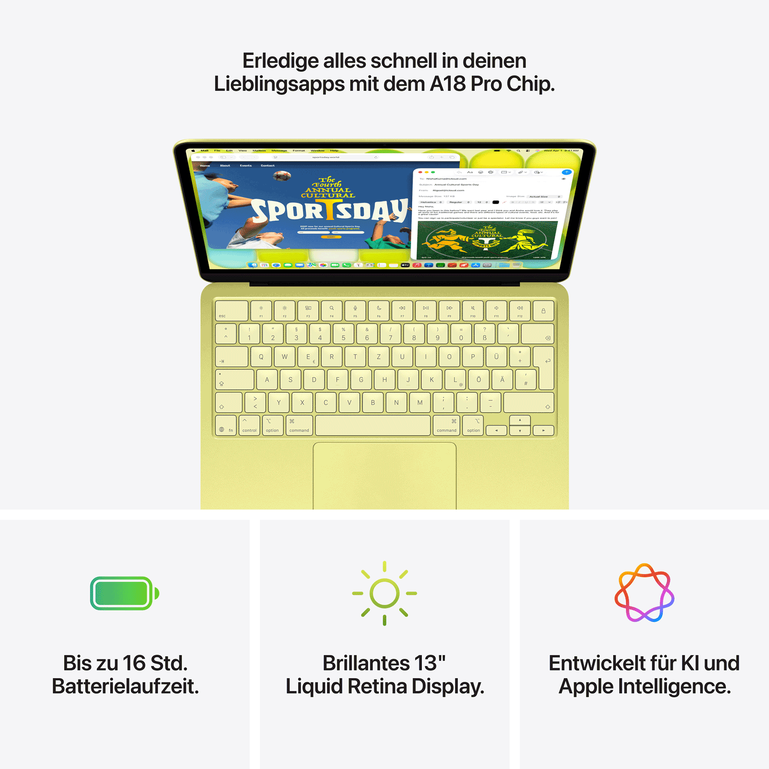 Das Apple MacBook Neo 13 ist der ideale Einstieg in die Welt der macOS-Notebooks – leicht, farbenfroh und leistungsstark für den Alltag. Mit dem Apple A18 Pro Chip meistert es Browsing, Office-Anwendungen, Foto-Editing und KI-Funktionen mühelos. Das 13-Zoll Liquid Retina Display mit 500 Nits Helligkeit und 1 Milliarde Farben sorgt für brillante Bilder, während die ganztägige Akkulaufzeit bis zu 16 Stunden Mobilität verspricht. Perfekt für Studenten, Berufstätige und Kreative, die ein kompaktes Gerät mit Apple-Qualität suchen.