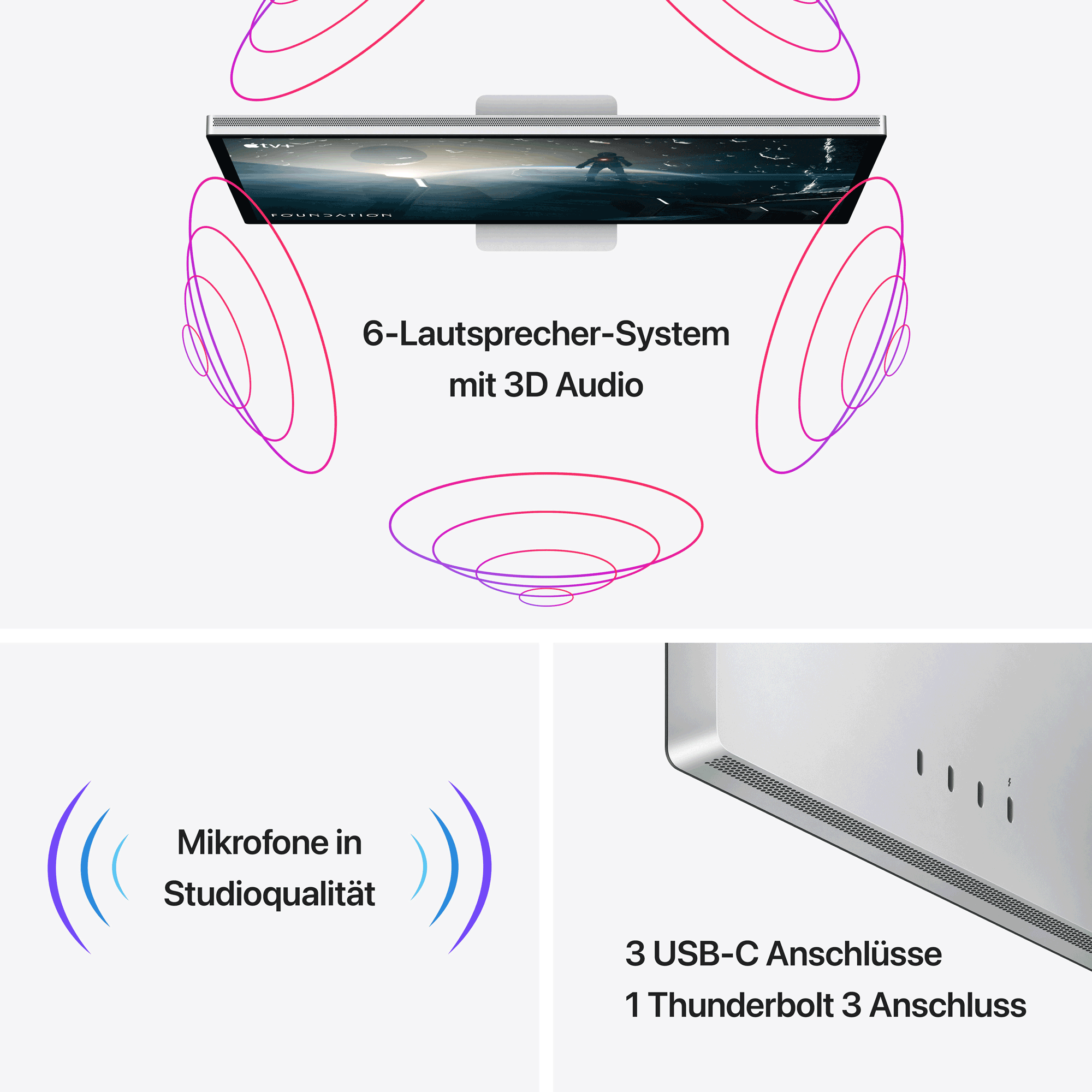 Wir stellen vor: Studio Display. Ein beeindruckendes 27" 5K Retina Display (Bildschirmgröße wird diagonal gemessen) mit einer 12-Megapixel-Kamera mit Center Stage, Mikrofonen in Studioqualität und einem Soundsystem mit sechs Lautsprechern. Passt wunderbar zu jedem Mac.