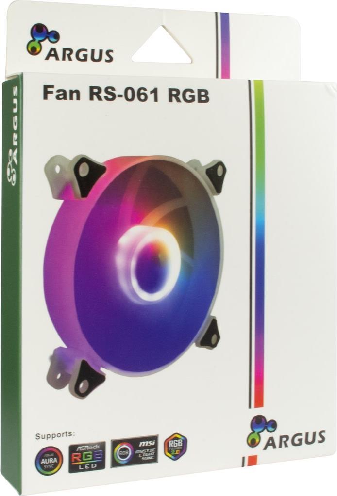 Der laufruhige 120 mm RGB LED-Lüfter von Argus bietet mit seinen insgesamt 8 innenliegend RGB-LEDs einen stylischen Effekt. Gummierte Auflagen in den Lüfterecken, auf beiden Seiten des Lüfters, sorgen für einen vibrationsfreien Betrieb und lassen die Option offen, ob der Lüfter kühle Luft ansaugen oder die warme Luft aus dem Gehäuse pusten soll.Der Anschluss erfolgt temperaturgeregelt über den 4-Pin PWM-Anschluss am Mainboard und wird zusätzlich noch am 3-Pin 5V RGB-Header des Mainboards angeschlossen, welcher für die synchronen Farbwechsel aller angeschlossenen Komponenten zuständig ist.Produkttext[/head]Argus RS-061 RGB – stylischer Lüfter mit RGB-EffektenDer laufruhige 120mm RGB LED-Lüfter von Argus bietet mit seinen insgesamt 8 innenliegend RGB-LEDs einen stylischen Effekt. Gummierte Auflagen in den Lüfterecken, auf beiden Seiten des Lüfters, sorgen für einen vibrationsfreien Betrieb und lassen die Option offen, ob der Lüfter kühle Luft ansaugen oder die warme Luft aus dem Gehäuse pusten soll.Der Anschluss erfolgt temperaturgeregelt über den 4Pin PWM-Anschluss am Mainboard und wird zusätzlich noch am 3Pin 5V RGB-Header des Mainboards angeschlossen, welcher für die synchronen Farbwechsel aller angeschlossenen Komponenten zuständig ist.[head]Hauptmerkmale