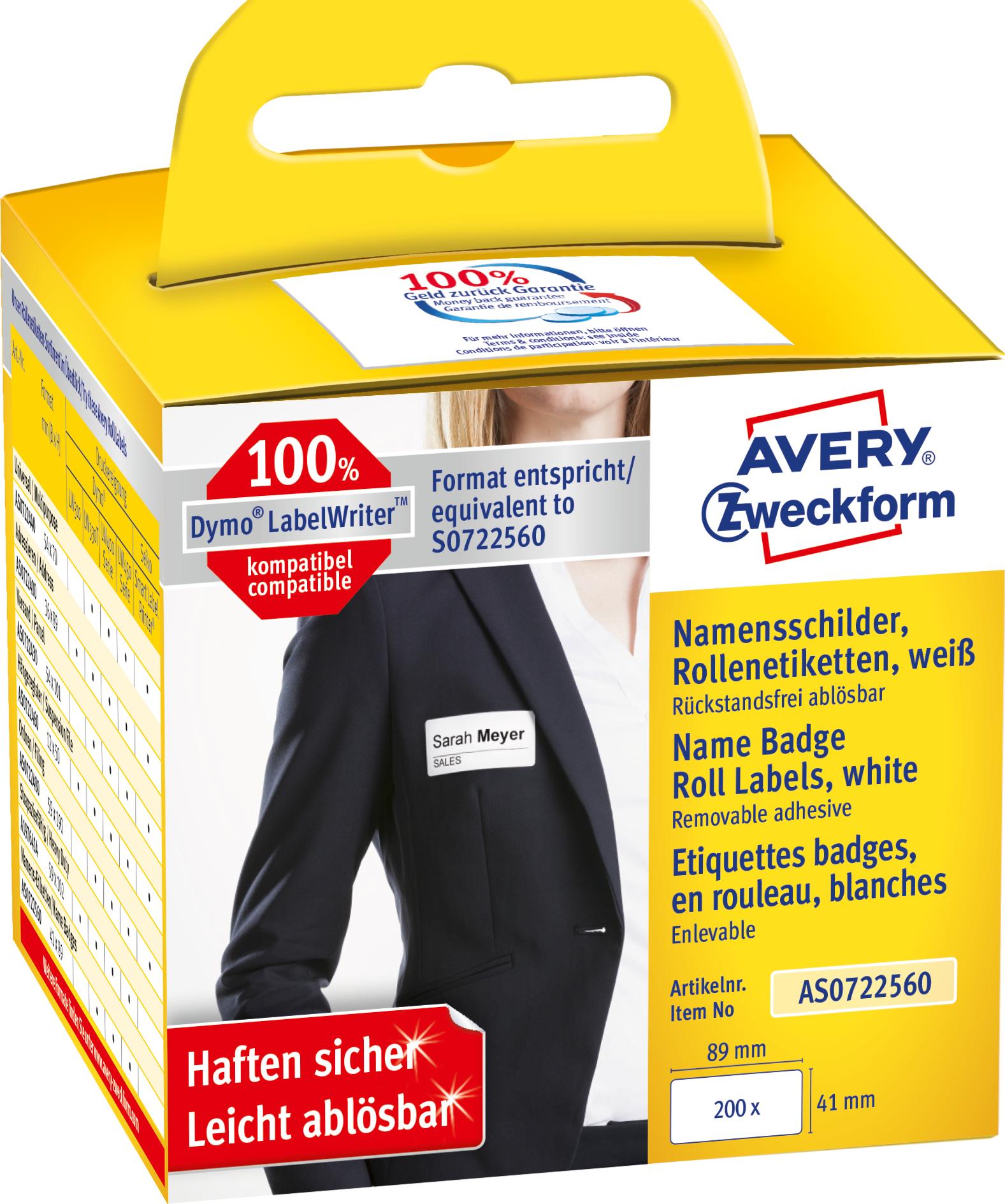 Avery Zweckform - Folie - entfernbarer Klebstoff - weiß - 41 x 89 mm 200 Etikett(en) (1 Rolle(n) Plaketten (AS0722560)