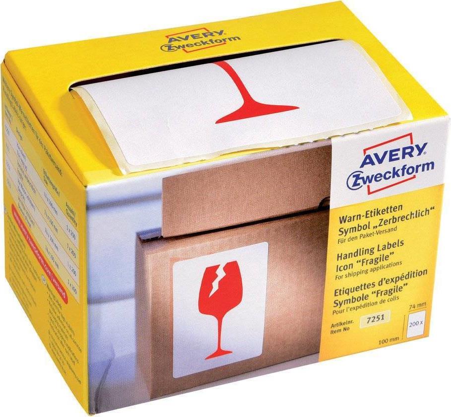 Die vorgedruckten Warnetiketten mit dem klar erkennbaren und international verständlichen Symbol für Vorsicht, zerbrechlich (Vorsicht Glas: zerbrochenes Glas) im Format 74x100 mm sind perfekt geeignet für Pakete, Päckchen, Rollen oder Umschläge. Der praktische Kartonspender mit jeweils 200 Warnaufklebern ermöglicht ein einfaches und schnelles Handling und eine saubere Aufbewahrung und ist somit auch für größere Packstationen ideal. Durch den speziell entwickelten Klebstoff haften die Warnetiketten sicher und zuverlässig auf allen gängigen Verpackungsmaterialien wie Briefumschlägen, Versandtaschen, Kartons, Folien etc. Zudem haben die Warnetiketten eine Perforation nach jedem Etikett und sorgen so für eine einfachere und schnellere Verarbeitung, perfekt für größere Versandaktionen. Die Warnetiketten im Kartonspender überzeugen durch Flexibilität und eine höhere Convenience. Vertrauen Sie bei Warnetiketten der bewährten Avery Zweckform Markenqualität.
