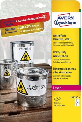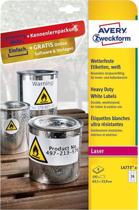Avery Zweckform - Polyester - matt - permanenter Klebstoff - weiß - 63.5 x 33.9 mm 192 Etikett(en) (8 Bogen x 24) wasserfeste Etiketten