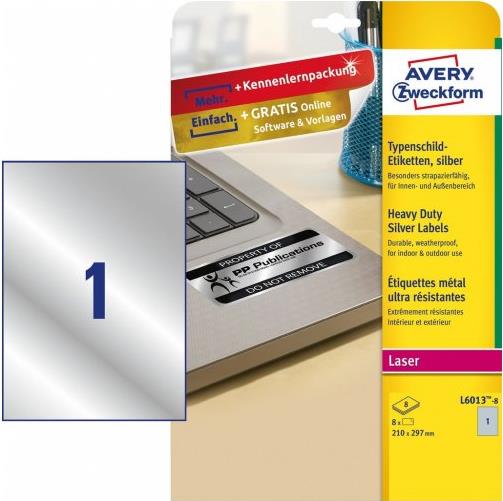 Avery Zweckform L6013-8. Produktfarbe: Silber, Form: Rechteck, Klebetyp: Dauerhaft. Breite: 210 mm, Höhe: 297 mm. Haftetiketten pro Blatt: 1 Stück(e), Aufkleber pro Satz: 8 Stück(e), Medienanzahl pro Paket: 8 Blätter (L6013-8)