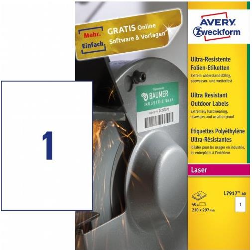 Avery - Polyethylen (PE) - matt - permanenter Klebstoff - weiß - A4 (210 x 297 mm) 40 Etikett(en) (40 Bogen x 1) Etiketten (L7917-40)