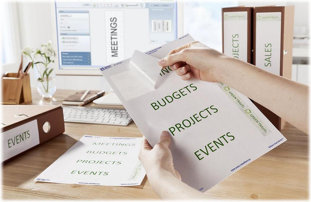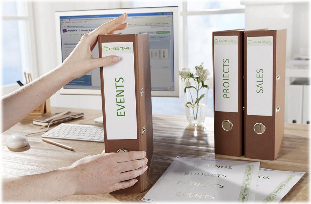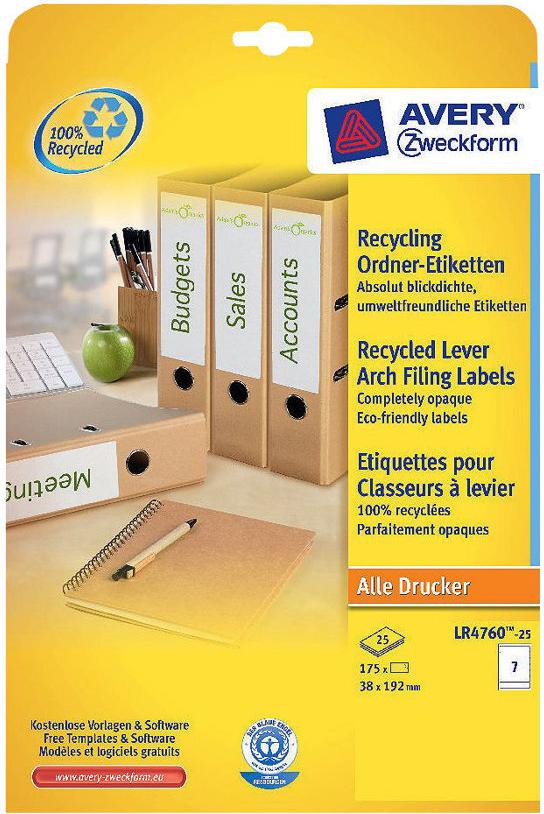 Verbringen Sie am Ende des Jahres sehr viel Zeit mit der Ablage Ihrer Unterlagen? Möchten Sie bei der Organisation Ihrer Unterlagen Zeit sparen? Kein Problem, die Recycling Ordner-Etiketten von Avery Zweckform helfen Ihnen dabei. Mit professionell gestalteten Ordnerrücken behalten Sie und Ihre Kollegen die Übersicht. Durch das blickdichte Material können Sie alte Ordner erneut verwenden. Die alte Beschriftung scheint nicht durch. Zusätzlich schonen Sie die Umwelt da diese Etiketten aus 100% Altpapier hergestellt werden. Die Rückenschilder lassen sich mit allen gängigen Druckern und Kopierern bedrucken.