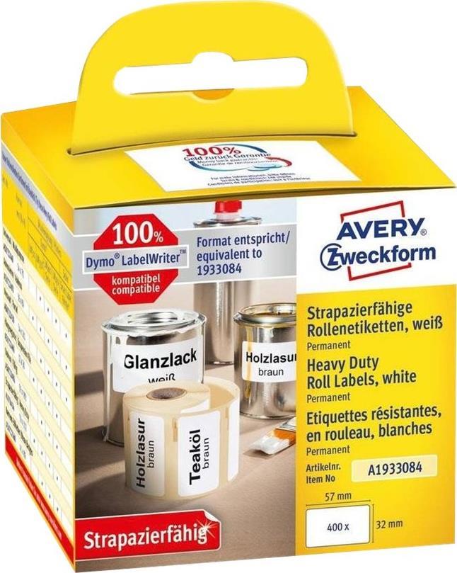 Die besonders strapazierfähigen Rollenetiketten A1933084 im Format 57 x 32mm von AVERY ZWECKFORM eignen sich z.B. ideal für Hinweis- und Warnschilder und Kennzeichungen in Lager, Produktion und Werkstätten. Die Etiketten sind 100% kompatibel mit dem Dymo® Labelwriter™ (LW310, LW330T, LW400 Serie, LW450 Serie, 4XL und LW Wireless). 400 Etiketten auf einer Rolle pro Packung. Die Rollenetiketten sind Wasser-, Schmutz-, Öl- und Temperaturbeständig (-20°C bis +60°C) sowie widerstandsfähig gegen Reinigungsmittel.