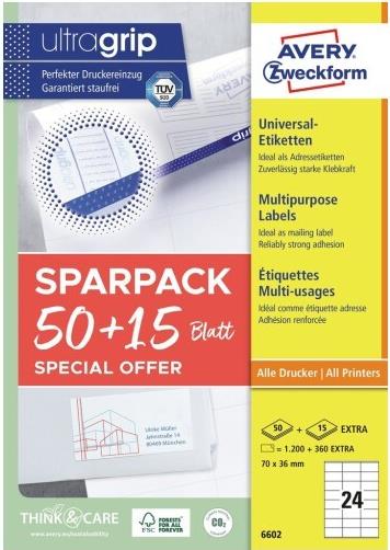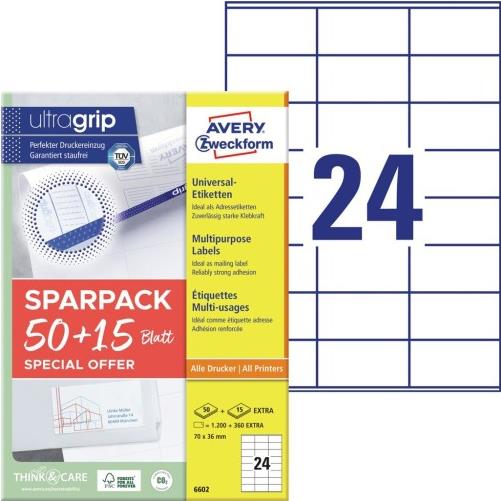 AVERY Zweckform Universal-Etiketten, 70 x 36 mm, 50 + 15 Bl. weiß, mit ultragrip-Technologie, Rand an Kopf und Fuß, - 1 Stück (6602)