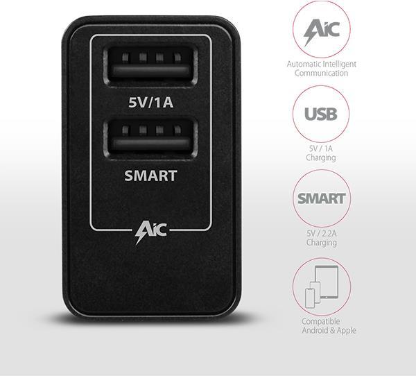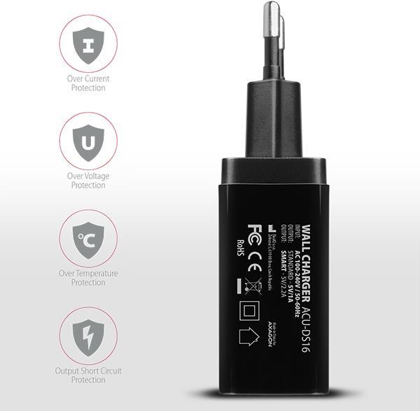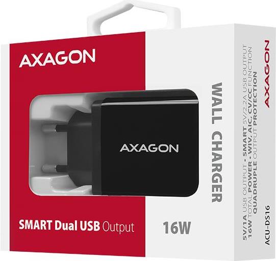 Duales USB-Netzladegerät AXAGON ACU-DS16 für das Aufladen von bis zu zwei Mobilgeräten gleichzeitig.