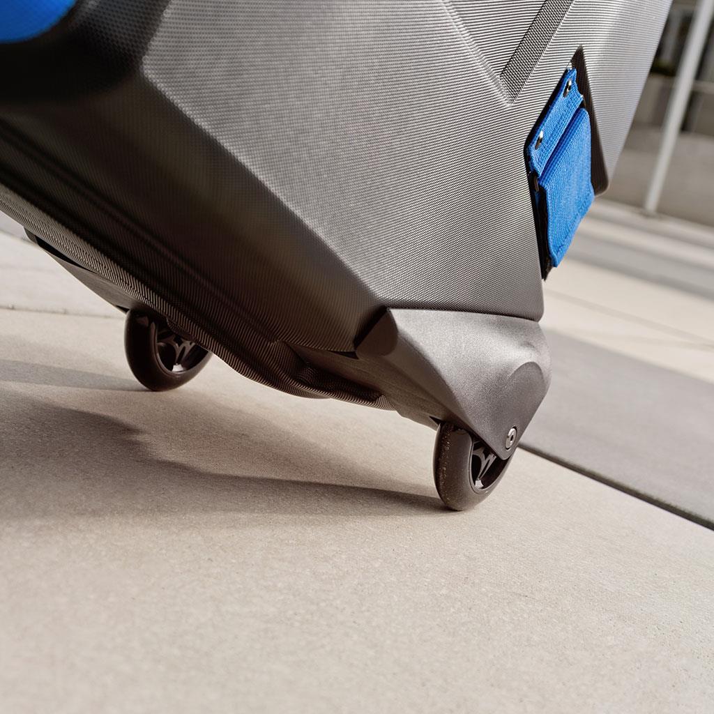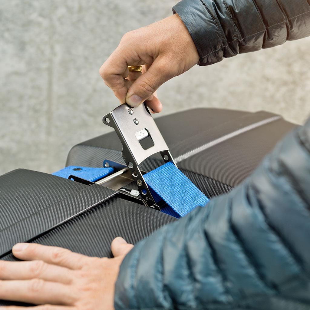 die beiden Kofferschalen greifen an sechs Punkten ineinander und werden mit einem selbst-spannenden Gurtsystem verschlossen