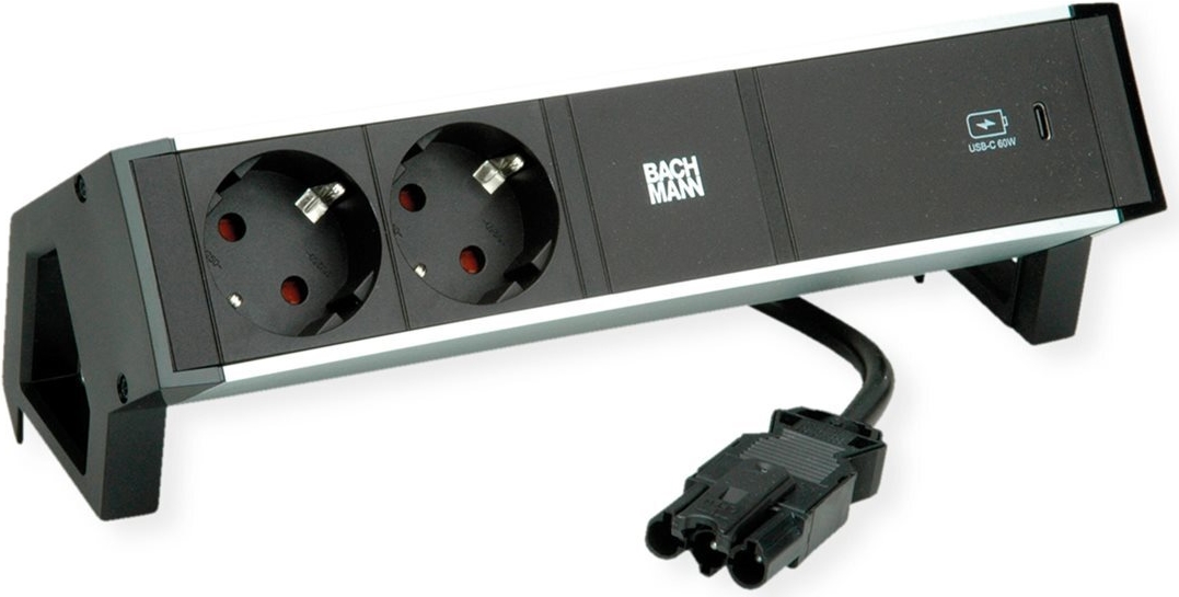 Bachmann DESK2 ALU BLACK Steckdoseneinheit mit erhöhtem Berührungsschutz 2xSchutzkontaktsteckdosen 88,90cm (35") schwarz 1xUSB C 60W Charger Zuleitung 0,2m H05VV-F3G1,5mm² schwarz mit GST18i3 Stecker Profil: Aluminium eloxiert (natur) Endkappen: ...