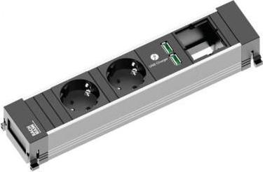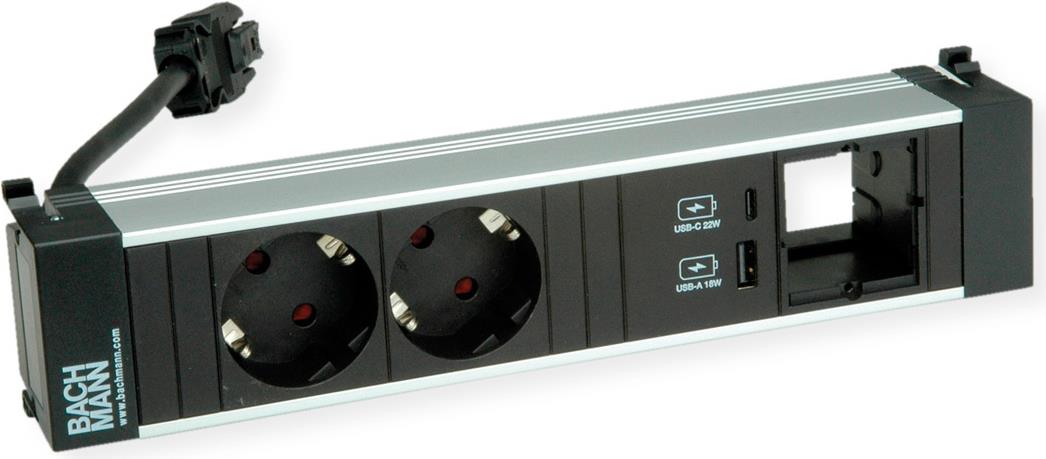 Bachmann Power Frame Steckdosenleiste ALU; 2xSchutzkontaktsteckdosen schwarz mit erhöhtem Berührungsschutz 1xUSB A&C 22W Charger 1xCustom Modul leer Stromeingang 0,2m H05VV-F3G1,5mm² mit GST18 Stecker; Zuleitung durch Endkappe Bedruckung Bachmann; Verpackung im Ka (916.504)