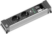 Bachmann Power Frame Steckdosenleiste ALU; 2xSchutzkontaktsteckdosen schwarz mit erhöhtem Berührungsschutz 1xUSB A&C 22W Charger 1xCustom Modul leer Stromeingang 0,2m H05VV-F3G1,5mm² mit GST18 Stecker; Zuleitung durch Endkappe Bedruckung ...