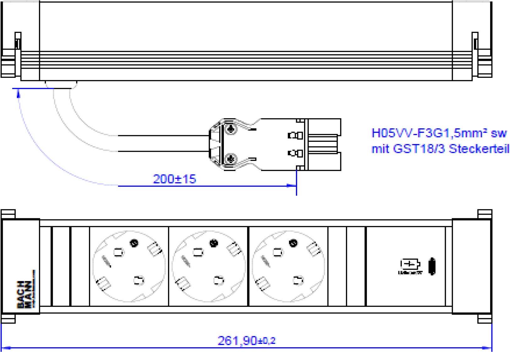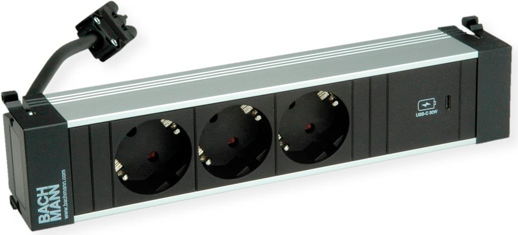Bachmann Power Frame Steckdosenleiste Medium ALU 3xSchutzkontaktsteckdosen schwarz mit erhöhtem Berührungsschutz 1xUSB C 30W Charger Stromeingang 0,2m H05VV-F3G1,5mm² mit GST18 Stecker; Zuleitung durch Endkappe Bedruckung Bachmann; Verpackung im ...