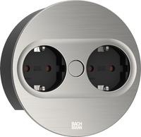 Bachmann TWIST 2 Metallische Abdeckscheibe rund, Edelstahl-Optik, 2xSchutzkontaktsteckdosen schwarz mit erhöhtem Berührungsschutz, Zuleitung 2,0m H05VV-F3G1,5mm² schwarz mit Aderendhülsen und beigelegtem Schutzkontakt-Montagestecker, verpackt im Karton. (946.000)