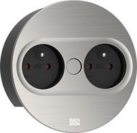 Bachmann TWIST 2 Metallische Abdeckscheibe rund, Edelstahl-Optik, 2xUTE Frankreich Steckdose schwarz mit erhöhtem Berührungsschutz, Zuleitung 2,0m H05VV-F3G1,5mm² schwarz mit Aderendhülsen und beigelegtem Schutzkontakt-Montagestecker, verpackt im Karton. (946.002)
