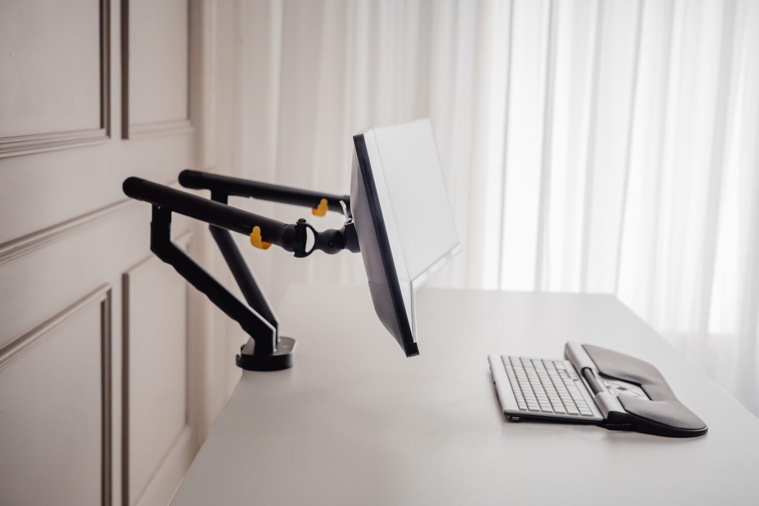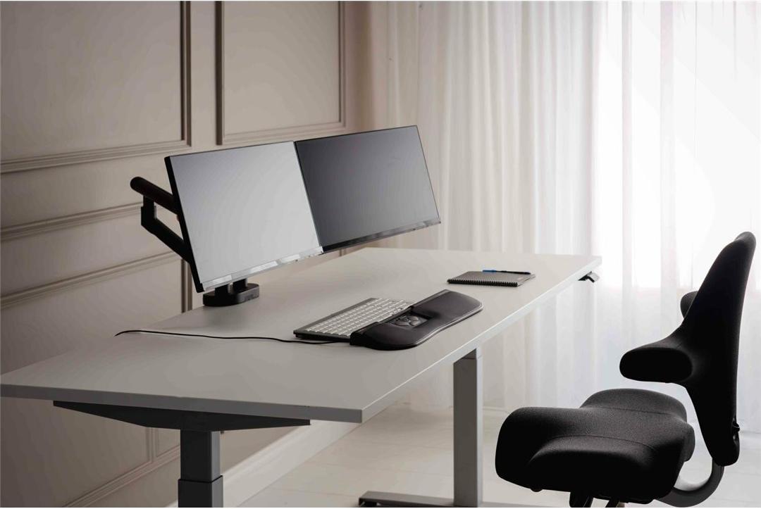 Dieser Dual-Monitor-Arm optimiert Ihren Arbeitsplatz, indem er Platz für zwei Monitore bietet, sodass Sie ergonomisch und effizient arbeiten können. Der BE Flexible Dual ist mit den modernsten Innovationen ausgestattet und lässt sich nicht nur schnell und mühelos installieren, sondern besteht auch zu 72 % aus recyceltem Material und ist zu 100 % recycelbar. Schaffen Sie Ihren ultimativen Arbeitsplatz mit Leichtigkeit.