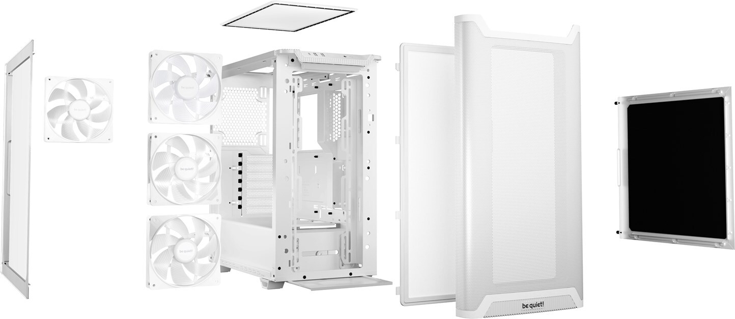 Das be quiet! Pure Base 501 LX wurde mit einem Midi-Tower-Formfaktor entwickelt, der Wert auf Geräuschreduzierung legt. Mit drei 120-mm-ARGB-Lüftern an der Vorderseite und einem 140-mm-ARGB-Lüfter an der Rückseite sorgt dieses Gehäuse für eine effektive Kühlung und eine ansprechende Optik. Das luftstromoptimierte Netz fördert die Belüftung, während die herausnehmbaren Staubfilter oben, vorne und unten die Wartung erleichtern und den Innenraum sauber halten. Ein integriertes Kabelmanagementsystem sorgt für einen übersichtlichen Aufbau, verbessert den Luftstrom und erleichtert den Zugang.