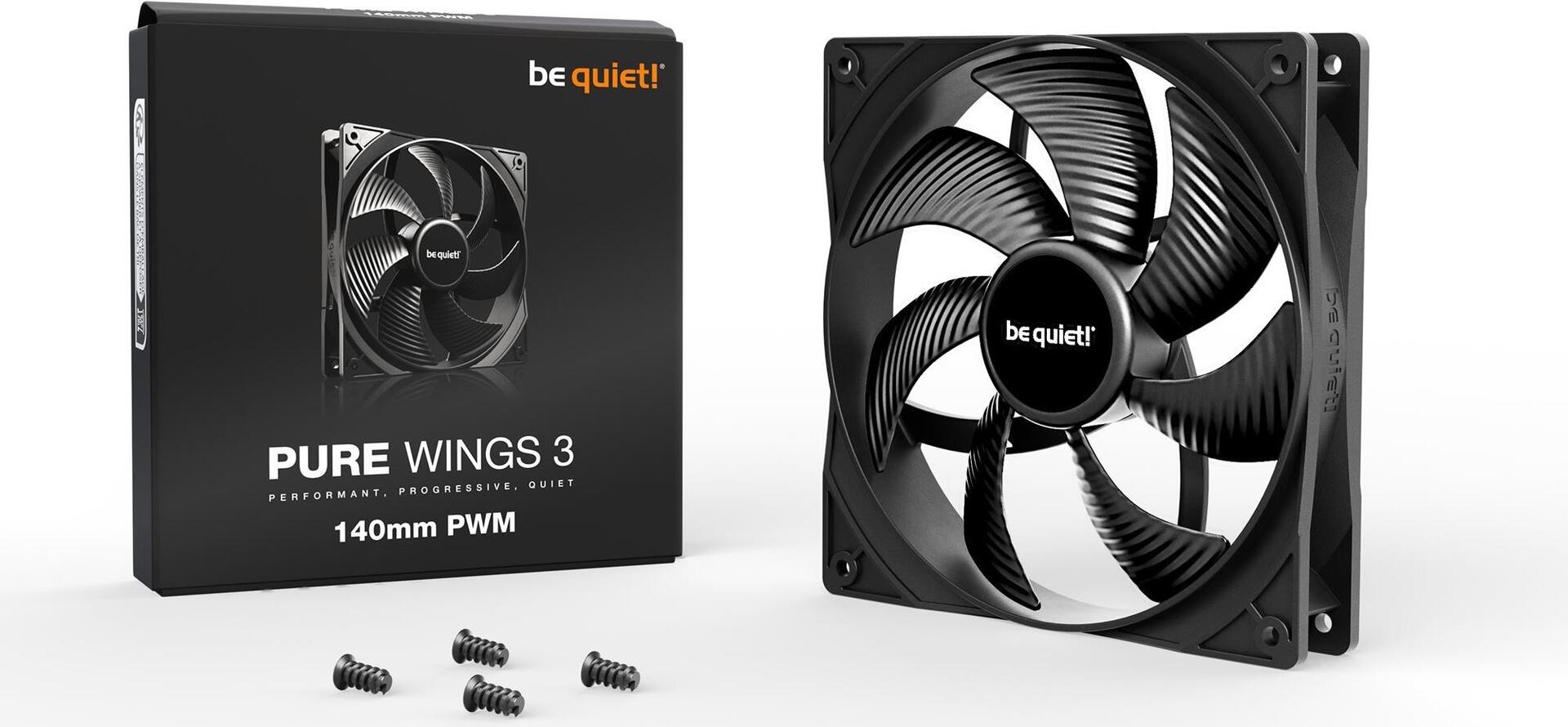 be quiet! Pure Wings 3 140mm PWM. Typ: Ventilator, Lüfterdurchmesser: 14 cm, Rotationsgeschwindigkeit (max.): 1200 RPM, Geräuschpegel (hohe Geschwindigkeit): 21,9 dB, Maximaler Luftstrom: 57,4 cfm, Luftstrom: 97,5 m³/h, Maximum Luftdruck: 0,96 mmH2O. Spannung: 5 - 13.2 V. Breite: 140 mm, Tiefe: 140 mm, Höhe: 25 mm. Produktfarbe: Schwarz (BL108)