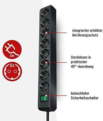 Brennenstuhl Eco-Line m. Schalter 8-fach schw 3,0m Steckdosenleiste 1159300018, schwarz, H05VV-F 3G1,5 Zuleitung 3.0 m