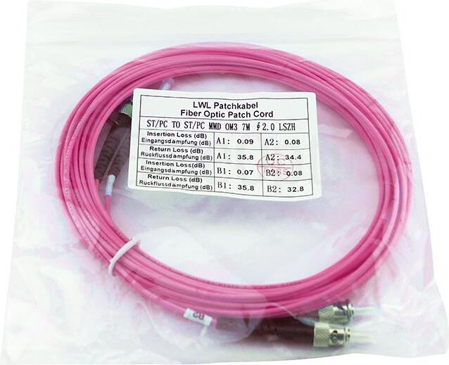 Optimale GlasfaserverbindungenBlueOptics© SFP3333FU1MK 1 Meter Glasfaser LWL Patchkabel mit ST/PC auf ST/PC Duplex Anschluss undLaseroptimierter Multimode Faser (LOMMF) der Faserkategorie OM4 (Fasertyp G50/125µm), in der Farbe Magenta. BlueOptics SFP3333FU1MK 1 Meter LWL ST-ST OM4 Duplex Patchkabel haben eine flammwidrige LSZH Ummantelung. BlueOptics SFP3333FU1MK 1 MeterMultimode OM4 LWL ST-ST Duplex Patchkabel sind für die Übertragung von 850nm Signalen ausgelegt und eignen sichbeispielsweise für die Verbindung von Patchpanel Ports untereinander oder dem damit verbundenen Anschluss von optischenTransceivern.Beste Dämpfungswerte BlueOptics SFP3333FU1MK 1 Meter Multimode OM4 LWL ST-ST Duplex Patchkabel haben einen Dämpfungswert von 2,5dB proKilometer, eine geringe Eingangsdämpfung (Input Loss) und eine hohe Rückflussdämpfung (Return Loss). Eine weitere Optimierungder Rückflussdämpfung durch die Anpassung der Schliffart (UPC oder 8° APC) ist ebenfalls möglich. BlueOptics SFP3333FU1MK 1 MeterMultimode OM4 LWL ST-ST Duplex Patchkabel sind in den Längen 0.5, 1, 2, 3, 5, 7.5, 10, 15, 20, 30 oder 50 Meter verfügbar.Individuelle Längen sind auf Anfrage ebenfalls erhältlich.Höchste KomponentenqualitätFür verlustfreie Übertragungsleistungen werden bei der Produktion von BlueOptics SFP3333FU1MK 1 Meter LWL ST-STOM4 Duplex Patchkabeln ausschließlich Markenfasern von bekannten Herstellern, wie Corning, Fujikura oder YOFC verwendet. Alleverbauten Stecker werden von Markenherstellern wie Amphenol, Diamond, Nissin Kasei oder Reichle & De-Massari mit hochzuverlässiger BlueOptics Zirkonia Keramikferrule gefertigt und erreichen eine Lebenszeit von bis zu 1500 Steckzyklen.Störungsfreie Übertragung BlueOptics SFP3333FU1MK 1 Meter LWL ST-ST OM4 Duplex Patchkabel werden nach der Produktion mit Interferometer undOptischer Zeitbereichsreflektometrie (OTDR) auf Ihre Qualität getestet. Ein Messprotokoll über die Werte der Eingangsdämpfung(Input Loss) und der Rückflussdämpfung (Return Loss) ist bei jedem ausgelieferten ST-ST OM4 Duplex Patchkabel enthalten.Industrielle Normen BlueOptics SFP3333FU1MK 1 Meter LWL ST-ST OM4 Duplex Patchkabel werden unter Berücksichtigung allgemein gültigerindustrieller Standards und Normen gefertigt und verfügen über eine flammwidrige LSZH Ummantelung. Somit entsteht imBrandfall eine sehr niedrige Rauchentwicklung im Vergleich zu Patchkabeln mit PVC Mantel. Des Weiteren wird kein Halogenfreigesetzt.Hauptmerkmale