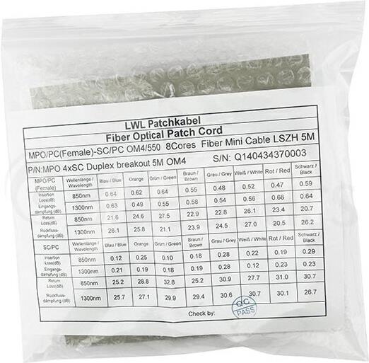 Optimale GlasfaserverbindungenBlueOptics© SFP6142FU1MK 1 Meter MTP (Multi- fiber Push-On) Breakout Kabel von CBO, mit 1x MTP/UPC auf 4x SC/UPC Duplex Anschluss, LSZH (Low Smoke Zero Halogen) Mantel, mit 8 Kernen und MTP Stecker ohne Pins als Multimode OM4 Variante (Fasertyp G50/125µm). BlueOptics SFP6142FU1MK 1 Meter Multimode OM4 MTP auf 4xSC Breakout Kabel haben eine flammwidrige LSZH Ummantelung. BlueOptics SFP6142FU1MK 1 Meter Multimode OM4 MTP auf 4xSC Breakout Kabel sind für die Übertragung von Signalen um 850nm ausgelegt und eignen sich beispielsweise für die Verbindung von MTP Kassetten untereinander oder dem damit verbundenen Anschluss von optischen Transceivern.Schnelle InstallationKeine Konfektionierung oder Tests mehr erforderlich. BlueOptics SFP6142FU1MK 1 Meter Multimode OM4 MTP auf 4xSC Breakout Kabel stellen die einfachste zu installierende Verkabelungslösung nach dem EN50173-5, sowie dem ISO/IEC 24764 Standard dar und sind sehr komfortabel in der Handhabung im Vergleich zu herkömmlichen LWL Verbindungen die Spleißarbeiten voraussetzen. Dank der kompakten Bauweise der BlueOptics SFP6142FU1MK 1 Meter Multimode OM4 MTP auf 4xSC Breakout Kabel ist ein schnelles Erstellen oder Erweitern einer LWL Installation möglich. Da kein Spleißgerät oder Spezialwerkzeug mehr benötigt wird, entfallen zudem aufwendige Schulungen der Mitarbeiter. Eine komfortable Lösung für den Einsatz in Rechenzentren, Storage Area Networks, lokalen Netzwerken und Zweigstellen.Höchste KomtpnentenqualitätFür verlustfreie Übertragungsleistungen werden bei der Produktion von BlueOptics SFP6142FU1MK 1 Meter Multimode OM4 MTP auf 4xSC Breakout Kabeln ausschließlich Markenfasern von bekannten Herstellern, wie Corning, Fujikura oder YOFC verwendet. Alle verbauten Stecker werden von Markenherstellern wie Amphenol, Diamond, Nissin Kasei oder Reichle & De-Massari mit hoch zuverlässiger BlueOptics Zirkonia Keramikferrule gefertigt und erreichen eine Lebenszeit von bis zu 1500 Steckzyklen.Störungsfreie Übertragung BlueOptics SFP6142FU1MK 1 Meter Multimode OM4 MTP auf 4xSC Breakout Kabel werden nach der Produktion mit Interferometer und Optischer Zeitbereichsreflektometrie (OTDR) auf Ihre Qualität getestet. Ein Messprotokoll über die Werte der Eingangsdämpfung (Input Loss) und der Rückflussdämpfung (Return Loss) ist bei jedem ausgelieferten Multimode OM4 MTP auf 4xSC Breakout Kabel enthalten. BlueOptics SFP6142FU1MK 1 Meter Multimode OM4 MTP auf 4xSC Breakout Kabel erfüllen Telcordia Anforderungen GR-326-Core 4.4.Industrielle Normen BlueOptics SFP6142FU1MK 1 Meter Multimode OM4 MTP auf 4xSC Breakout Kabel werden unter Berücksichtigung allgemein gültiger industrieller Standards und Normen gefertigt und verfügen über eine flammwidrige LSZH Ummantelung. Somit entsteht im Brandfall eine sehr niedrige Rauchentwicklung im Vergleich zu MTP auf 4xSC Breakout Kabeln mit PVC Mantel. Des Weiteren wird kein Halogen freigesetzt. BlueOptics SFP6142FU1MK 1 Meter Multimode OM4 MTP auf 4xSC Breakout Kabel berücksichtigen folgende Normen: IEC-61034, IEC-754-1, IEC 60332-1, IEC 60332-3, IEC/EN 60950 und RoHS.Handeln Sie jetzt!Durch den Einsatz von BlueOptics MTP auf 4xSC Breakout Kabeln, können Netzwerke für steigende Anforderungen gerüstet werden. Unabhängig davon, ob ein erhöhtes Datenaufkommen, höhere Übertragungsraten, größere Skalierbarkeit, höhere Leistung und/oder eine höhere Zuverlässigkeit gewünscht wird. Mit BlueOptics MTP auf 4xSC Breakout Kabeln optimieren Sie Ihre Verbindungen und reduzieren Ihre OPEX und CAPEX Kosten.Hauptmerkmale