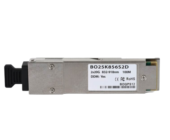 BlueOptics QSFP-40G-SRBD-BO. SFP Transceiver-Typ: Faseroptik, Schnittstelle: QSFP, Maximal mögliche Übertragungsstrecke: 100 m. Produktfarbe: Silber. Gewicht: 40 g. Paketgewicht: 50 g (QSFP-40G-SRBD-BO)