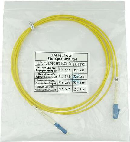 Optimale Glasfaserverbindungen BlueOptics SFP2121BU50MK 50 Meter Glasfaser LWL Patchkabel mit LC/UPC auf LC/UPC Simplex Anschluss und Singlemode Faser (SMF) der Faserkategorie SM G.657.A1 (Fasertyp E9/125µm), in der Farbe Gelb. BlueOptics SFP2121BU50MK 50 Meter LWL LC-LC SM G.657.A1 Simplex Patchkabel haben eine flammwidrige LSZH Ummantelung. BlueOptics SFP2121BU50MK 50 Meter Singlemode SM G.657.A1 LWL LC-LC Simplex Patchkabel sind für die Übertragung von 1310nm / 1550nm Signalen ausgelegt und eignen sich beispielsweise für die Verbindung von Patchpanel Ports untereinander oder dem damit verbundenen Anschluss von optischen Transceivern.Beste Dämpfungswerte BlueOptics SFP2121BU50MK 50 Meter Singlemode SM G.657.A1 LWL LC-LC Simplex Patchkabel haben einen Dämpfungswert von 0,4dB pro Kilometer, eine geringe Eingangsdämpfung (Input Loss) und eine hohe Rückflussdämpfung (Return Loss). Eine weitere Optimierung der Rückflussdämpfung durch die Anpassung der Schliffart (UPC oder 8° APC) ist ebenfalls möglich. BlueOptics SFP2121BU50MK 50 Meter Singlemode SM G.657.A1 LWL LC-LC Simplex Patchkabel sind in den Längen 0.5, 1, 2, 3, 5, 7.5, 10, 15, 20, 30 oder 50 Meter verfügbar. Individuelle Längen sind auf Anfrage ebenfalls erhältlich.Höchste KomponentenqualitätFür verlustfreie Übertragungsleistungen werden bei der Produktion von BlueOptics SFP2121BU50MK 50 Meter LWL LC-LC SM G.657.A1 Simplex Patchkabeln ausschließlich Markenfasern von bekannten Herstellern, wie Corning, Fujikura oder YOFC verwendet. Alle verbauten Stecker werden von Markenherstellern wie Amphenol, Diamond, Nissin Kasei oder Reichle & De-Massari mit hoch zuverlässiger BlueOptics Zirkonia Keramikferrule gefertigt und erreichen eine Lebenszeit von bis zu 1500 Steckzyklen.Störungsfreie Übertragung BlueOptics SFP2121BU50MK 50 Meter LWL LC-LC SM G.657.A1 Simplex Patchkabel werden nach der Produktion mit Interferometer und Optischer Zeitbereichsreflektometrie (OTDR) auf Ihre Qualität getestet. Ein Messprotokoll über die Werte der Eingangsdämpfung (Input Loss) und der Rückflussdämpfung (Return Loss) ist bei jedem ausgelieferten LC-LC SM G.657.A1 Simplex Patchkabel enthalten. BlueOptics SFP2121BU50MK 50 Meter LWL LC-LC SM G.657.A1 Simplex Patchkabel erfüllen Telcordia Anforderungen GR-326-Core 4.4.Industrielle Normen BlueOptics SFP2121BU50MK 50 Meter LWL LC-LC SM G.657.A1 Simplex Patchkabel werden unter Berücksichtigung allgemein gültiger industrieller Standards und Normen gefertigt und verfügen über eine flammwidrige LSZH Ummantelung. Somit entsteht im Brandfall eine sehr niedrige Rauchentwicklung im Vergleich zu Patchkabeln mit PVC Mantel. Des Weiteren wird kein Halogen freigesetzt.Hauptmerkmale